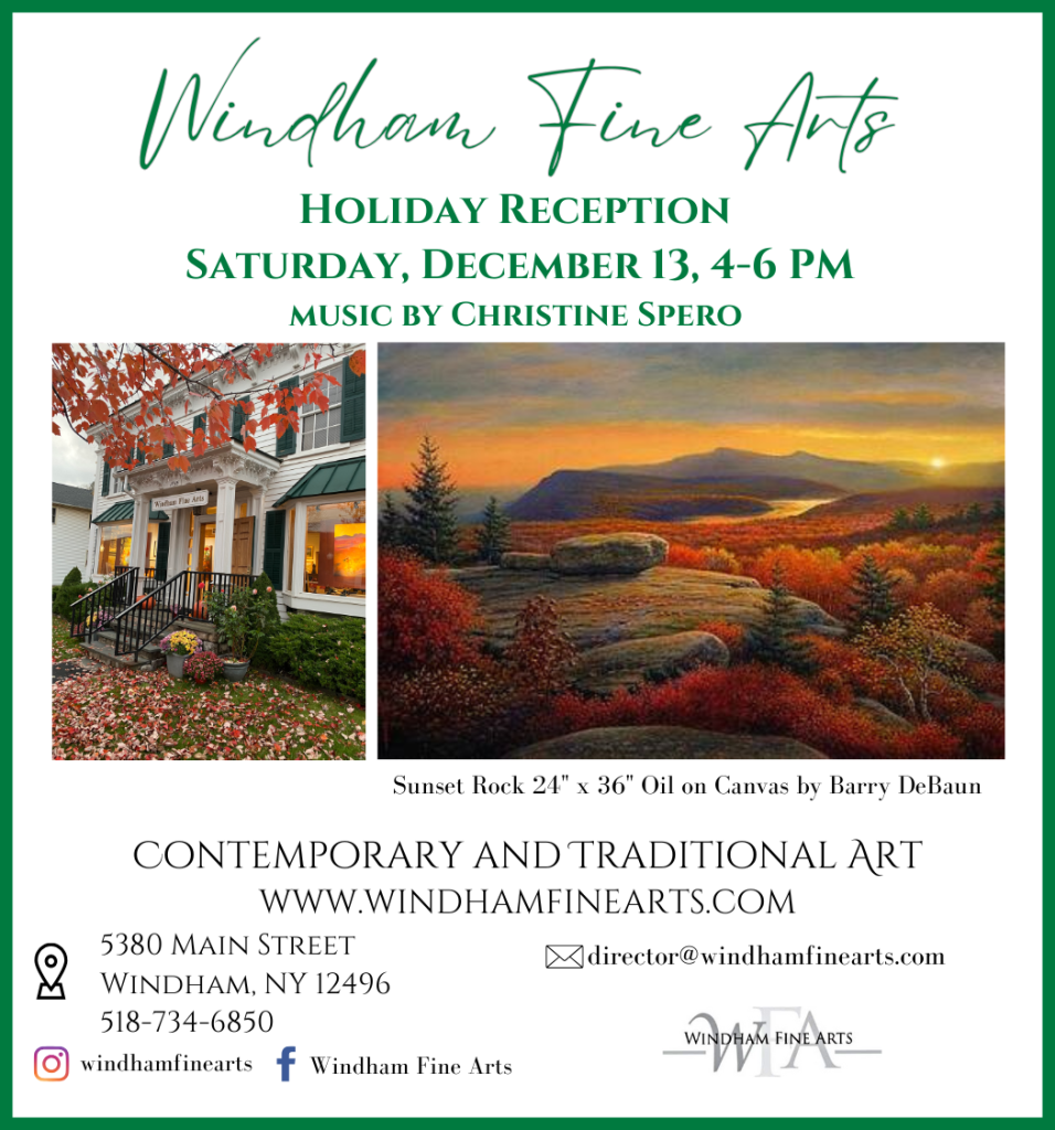 Windham Fine Arts presents Winter’s Gaze, featuring new artwork by Loreen Oren, where winter comes alive in the mountains and on the slopes. Working in oils, Loreen seamlessly. blends artistic intuition with structural design; her work captures nature’s rhythm and flow. As shadows cross and the chairlift ascents, you smile—I love the Catskills. Visit Windham Fine Arts at 5380 Main Street, the go-to gallery for art and inspiration. Open 12 – 5. Commissioned artwork by appointment.