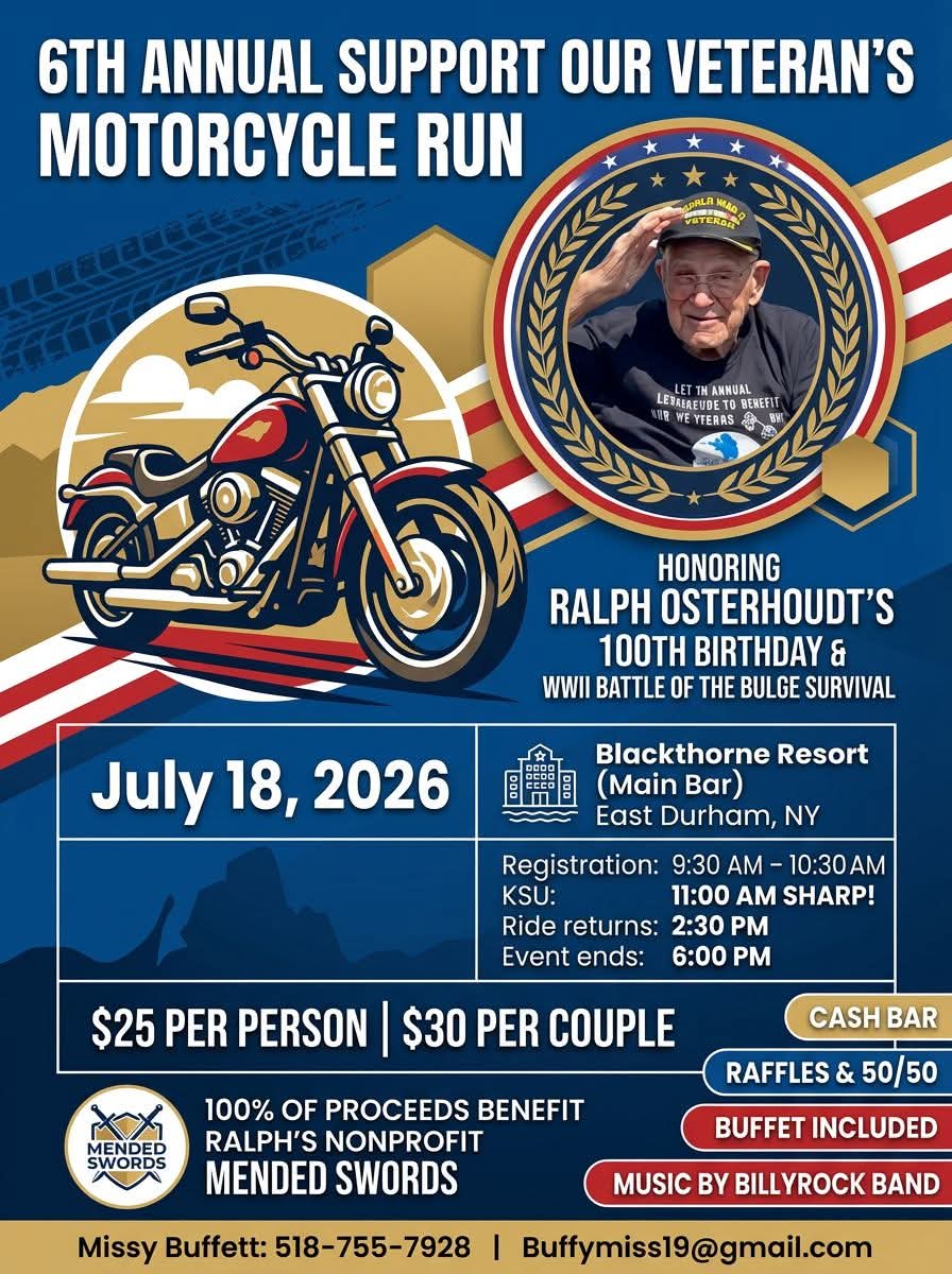 Celebrate WWII Army veteran Ralph Osterhoudt’s 100th birthday with a scenic Catskill motorcycle ride and fundraiser for veterans. The celebration continues at Blackthorne Resort with food, live music, raffles, and more—all benefiting a veteran nonprofit.