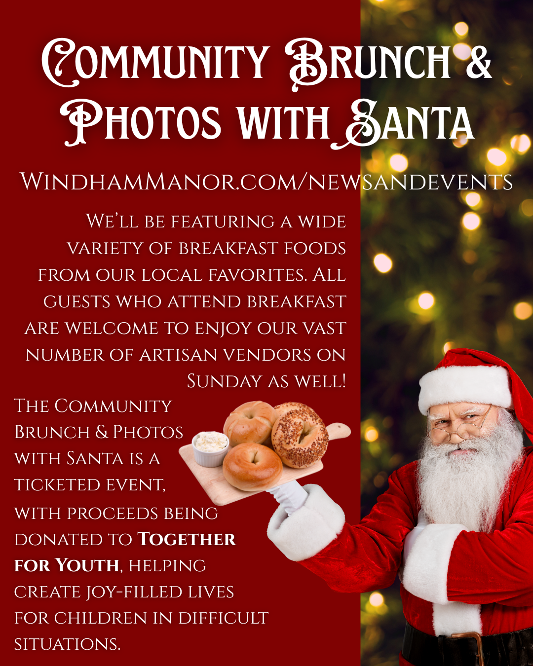 Join us for our annual Community Brunch & Photos with Santa on Sunday, November 30th, from 11am–2pm at Windham Manor! Enjoy a delicious breakfast featuring local favorites, snap festive photos with Santa, and explore our artisan vendors. All proceeds benefit Together for Youth, supporting children in need.