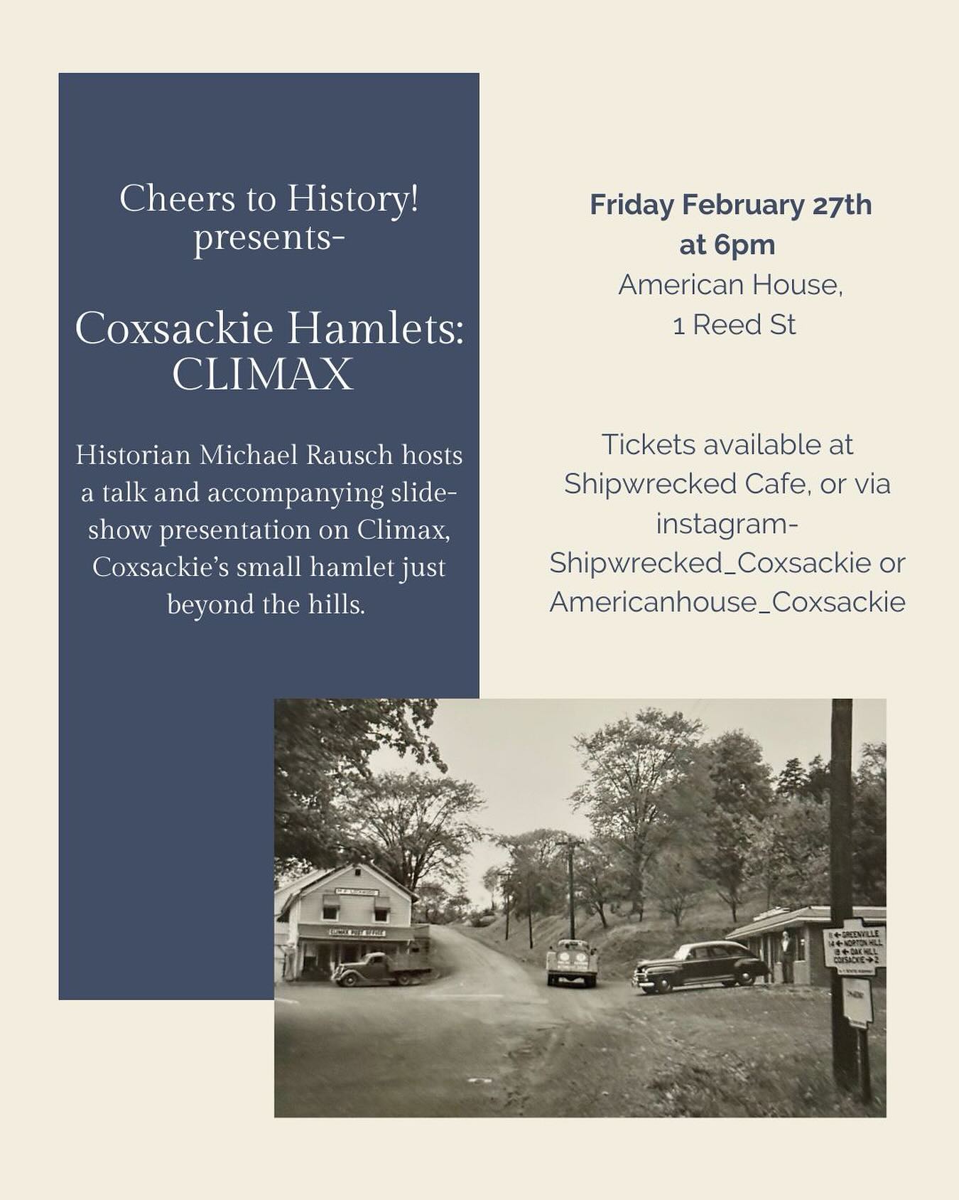 Town historian Michael Rausch returns with Coxsackie Hamlets, Part 1: Climax, a slideshow talk exploring the history of a small hamlet west of Coxsackie, with proceeds benefiting the Coxsackie Historical Society.