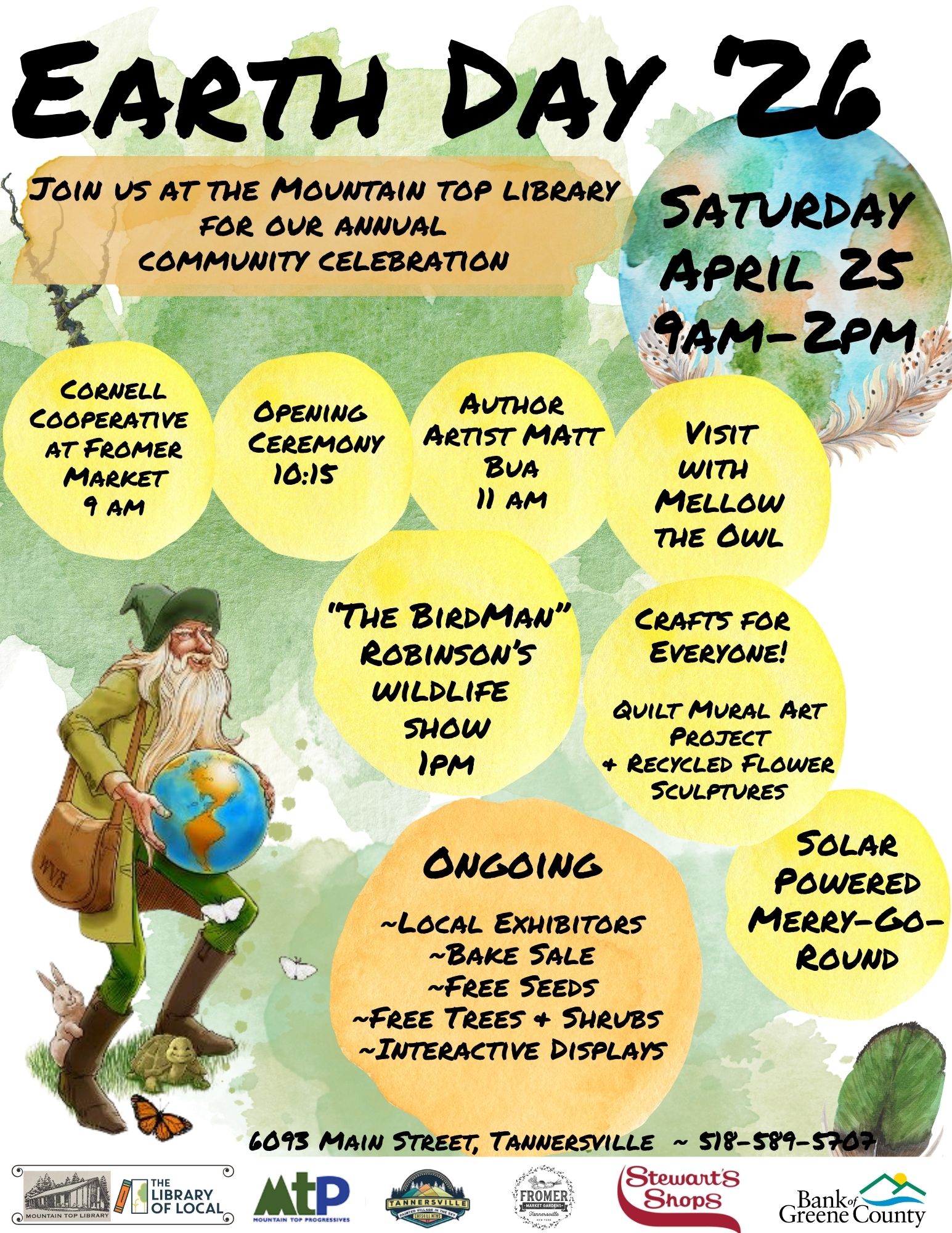 Join us for the 8th Annual Earth Day Celebration at Mountain Top Library in Tannersville. This beloved community event highlights the region’s rich conservation history with activities for all ages, including wildlife presentations, interactive exhibits, art projects, free seeds, a bake sale, and more.