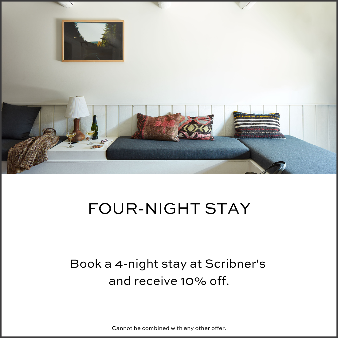Enjoy a relaxing four-night stay at Scribner's Catskill Lodge. Book your 4-night stay now and receive 10% off your total booking. Whether you're looking to unwind in our luxurious lodge, explore the breathtaking mountain views, or take advantage of nearby outdoor adventures, this package offers the perfect opportunity for an extended getaway.