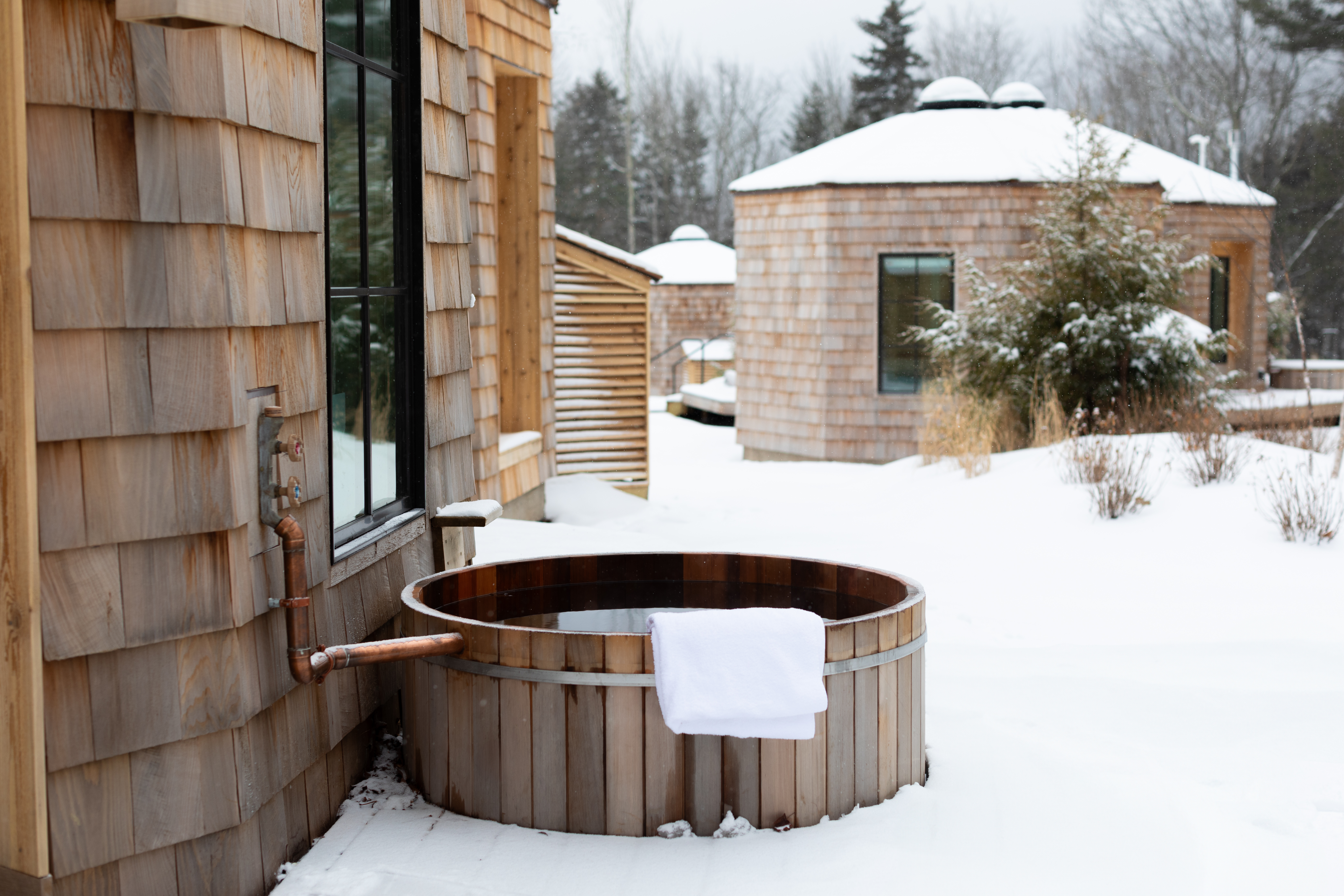 Round Suites: Luxurious escape with two connected structures. Relax in a 360° sunken sofa, daybed, and reading nook. Unwind in a private Japanese soaking tub and gaze at the stars through the oculus. Private lawn, deck, and Lodge access nearby.